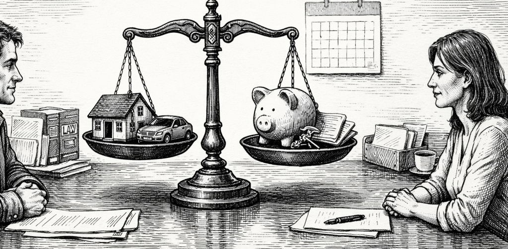 Antes de repartir lo que queda, hay que saldar las deudas contraídas durante el matrimonio. Esto garantiza que el reparto se haga sobre un patrimonio neto real, sin cargas pendientes.
